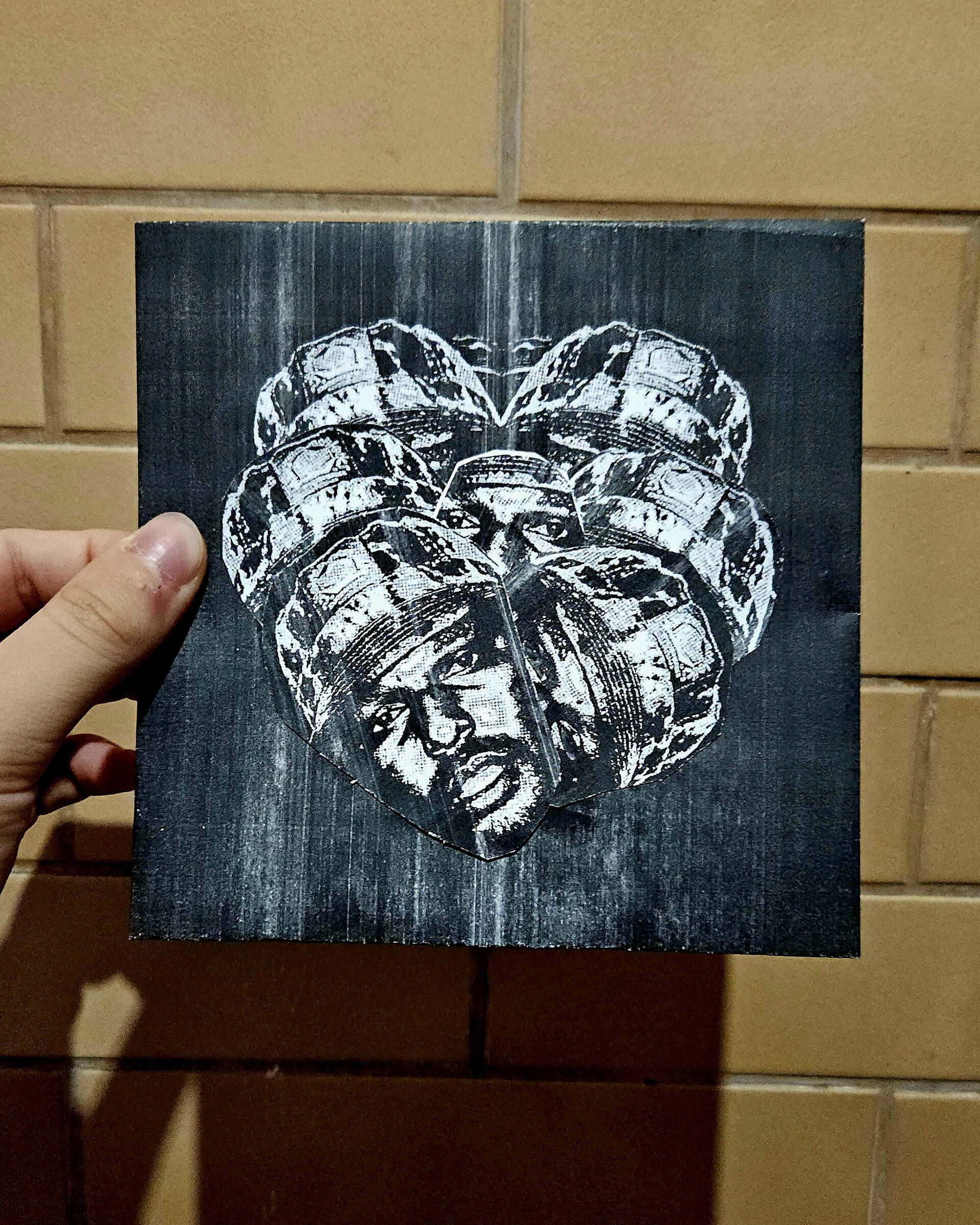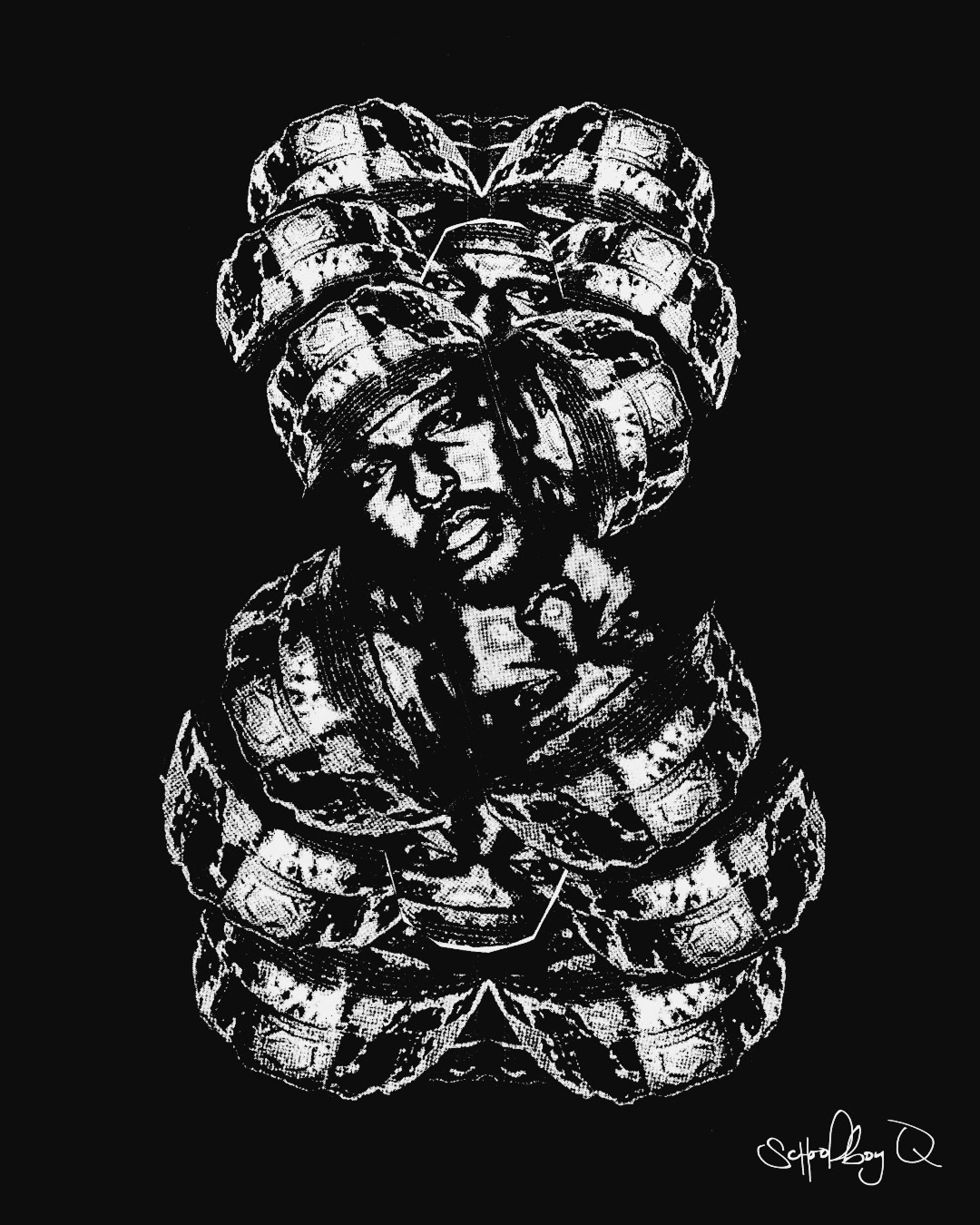 Mixed media collage where I cut and glued together copies of a still from a ScHoolboy Q music video, which I printed with my broken printer (leading to the distressing on the paper). I scanned the collage and turned it into a bizarre piece. It sort of resembles those paintings of a serpent eating its own tail.
